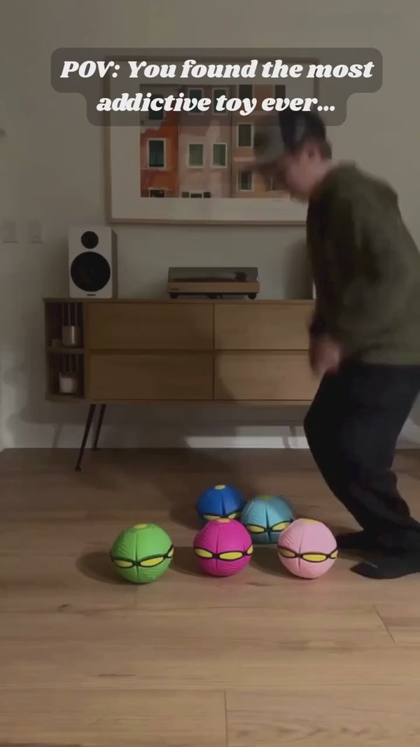 PopBall™ uses a simple push-and-pop mechanism — press it flat, toss it, and it pops back into a ball during play.